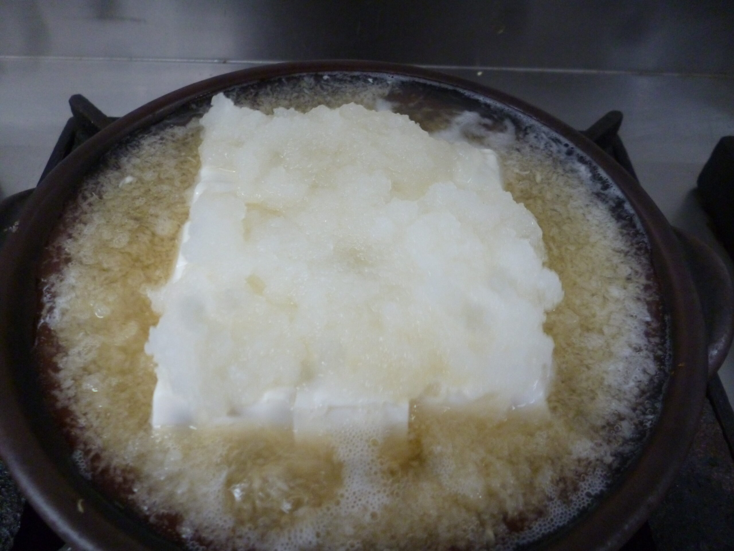 まだまだ寒い日が続く。そんな時期に雪鍋なんってのもいいですよ。湯豆腐を作る量量で最後に大根おろしを上にのせる。火が通れば完成。いたってシンプル。湯に塩味を付けて豆腐が煮崩れしないようして取り皿にとって食べれば体も温まるし、胃にもやさしい。後はそれぞれ好みで柚子の皮を刻んで入れても良いし、ポン酢で食べてもOK。ウチでは甘汁で豆腐に火をいれておろしを上にのせて提供している。